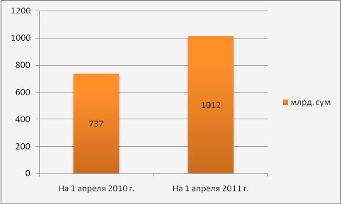 Объем кредитов, выданных на инвестиционные цели по сравнению с аналогичным периодом прошлого года, увеличился на 37 процентов и по состоянию на 1 апреля текущего года составил 1 трлн. 12 млрд. сумов. (Диаграмма 2.2.1)