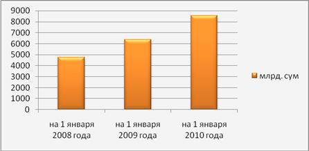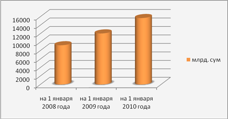В 2010 году суммарные активы коммерческих банков выросли на 30 процентов, и составил более 15,7 трлн. сумов. Данный показатель более чем в 2 раза превышает объемы средств, находящихся на счетах физических и юридических лиц, обеспечивая их полную защиту и гарантируя своевременность платежей. Необходимо отметить общая текущая ликвидность банковской системы в 10 раз превышает текущих обязательств банков по внешним платежам. Иными словами, создана прочная «подушка безопасности» всей банковской системы. (Диаграмма 2.2.2)