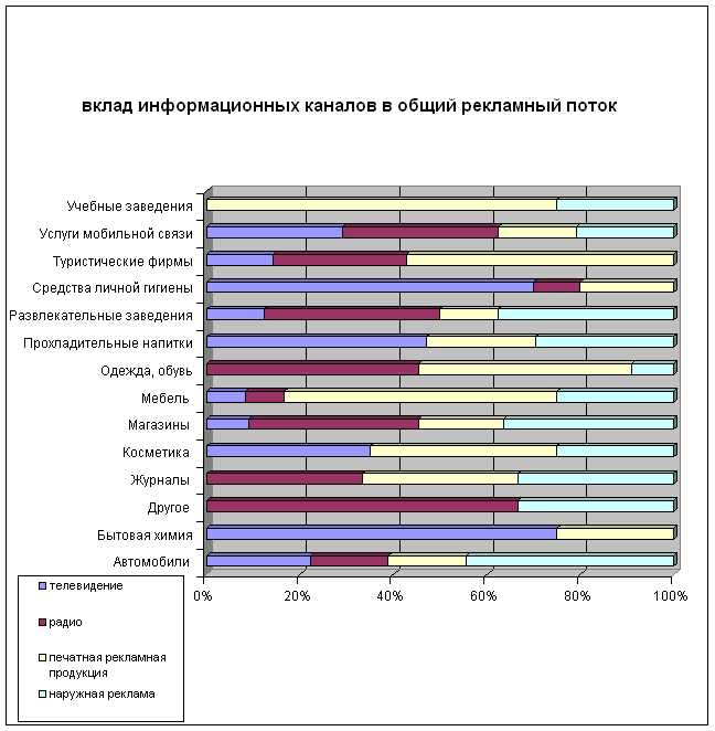 Рисунок 2 предпочтительнее тем, что позволяет сравнить вклады информационных каналов в общий рекламный поток по товарам. Например, у товарный группы "другое" процент упоминаний по телевидению равен около 70%, а у группы «журналы» процент упоминаний по телевидению не превышает 40%.