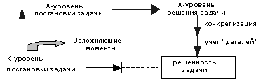 Организационную точку зрения Богданов рассматривал как универсально-обобщенную и призванную служить средством решения практических задач. «Весь опыт науки убеждает нас, что возможность и вероятность решения задач возрастают при их постановке в обобщенной форме… Обобщение в то же время есть упрощение. Задача сводится к минимальному числу наиболее повторяющихся элементов; из нее выделяются, и отбрасываются многочисленные осложняющие моменты; понятно, что решение этим облегчается; а раз оно получено в такой форме, переход к более частной задаче совершается путем обратного включения устраненных конкретных данных. Так мы приходим к вопросу об универсально-обобщенной постановке задач. Это и есть наша постановка». Богданов для повышения результативности решения конкретных, практических задач (К-уровень) (Рис. 1), предполагает обязательное сведение процесса решения задач к выявлению абстрактной (А-уровень) составляющей в процессе решения. Решение абстрактной, облегченной задачи при переводе на конкретный уровень, при детализации позволяет получить конкретное решение. Этим методом, методом дедукции и пользуется Богданов при постановке и решении тектологических задач.