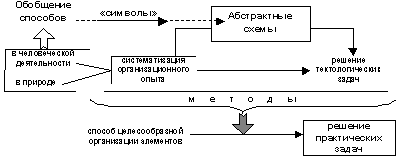 Методы всякой науки определяются, прежде всего, ее задачами. Задача тектологии, по Богданову, как науки эмпирической, систематизировать организационный опыт. Тектология должна выяснить, какие способы организации наблюдаются в природе и в человеческой деятельности; затем – обобщить и систематизировать эти способы; далее – объяснить их, т.е. выработать абстрактные схемы их тенденций и закономерностей, определить направления развития организационных методов и их роль в мировом процессе (Рис. 2). Этот общий план, аналогичен плану любой из естественных наук, но охватывает «материю» всех других наук и всей жизненной практики, только со стороны метода. Тектологическое обобщение должно считаться с фактами бесконечно разнообразными, преодолевать и силу привычки, и предрассудки специализации. Аналог тектологии Богданов видит в математике, которая берет все явления как величины и подчиняет их одним и тем же формулам, отвлекается от всего конкретного характера элементов, скрытых под ее схемами. Таким же образом должна поступать и тектология. Ее обобщения должны скрывать эту конкретность под безразличными «символами», своими «формулами», методами.