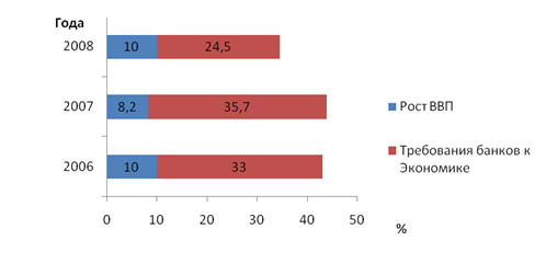 Рисунок 1 - Темпы роста ВВП и требования банков к экономике в 2006-2008 годах в сопоставимых ценах, %