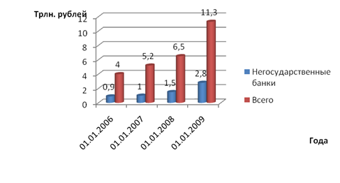 В уставные фонды банков с преобладающей долей государственной собственности государством внесены средства, которые увеличили банковский капитал в общей сложности на 3 трлн. рублей. В целом к концу 2008 года нормативный капитал банковского сектора страны достиг 11,3 трлн. рублей, увеличившись за год на 73,3 % в соответствии с рисунком 2