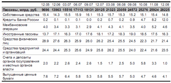 Объем государственной поддержки, оказанной российскому банковскому сектору за период августа-декабря 2008 г., составил 4 трлн. руб. Около 3.5 трлн. руб. пришлось на различные инструменты рефинансирования Центробанка, остальное –на средства федерального правительства (в основном – 400 млрд. руб. из средств Фонда национального благосостояния, размещенных в ВЭБе). В результате доля кредитов Банка России в пассивах банковского сектора превысила 12%, обеспечив более 40% годового прироста совокупных пассивов банков. Отметим, что в отсутствие столь масштабного рефинансирования банковского сектора увеличение объема пассивов в 2008 г. не превысило бы 25%(Таблица 1).