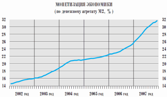 За 2007 год скорость обращения денег, рассчитанная по денежному агрегату М2, снизилась в среднегодовом выражении на 18,8%, то есть более существенно, чем за 2006 год (на 13,2%). Коэффициент монетизации экономики (по денежному агрегату М2) увеличился с 26,1 до 32,2% (рис.1).