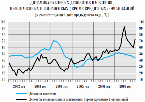 В 2007 году наметилась смена тенденции устойчивого повышения годовых темпов прироста срочных рублевых депозитов, основную часть которых (68—80%) формируют срочные вклады населения. На протяжении двух предшествующих лет темпы прироста этих вкладов устойчиво возрастали, увеличивая долю срочных рублевых депозитов физических лиц в структуре использования денежных доходов населения. В 2007 году темпы прироста срочных рублевых депозитов физических лиц стали замедляться и составили в целом за год 39,9% против 48,8% годом ранее (рис. 2). Одной из причин такой динамики стал перевод средств с рублевых на валютные вклады, что подтверждается ускорением в несколько раз в отчетном году по сравнению с 2006 годом темпов прироста депозитов населения в иностранной валюте. Одним из факторов, обусловивших этот процесс, было снижение на протяжении 2007 года ставок по рублевым депозитам сроком свыше 1 года, которые в последние годы занимали наибольший удельный вес в структуре депозитов физических лиц. Кроме того, ускорение инфляции во второй половине 2007 года, снизившее привлекательность сбережений, в определенной степени также повлияло на замедление роста рублевых вкладов физических лиц (Приложение 2).