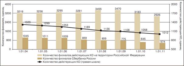 Крупные многофилиальные банки в 2010 году, расширяя свое присутствие на региональных рынках банковских услуг, одновременно проводили политику снижения издержек за счет оптимизации своих региональных подразделений. Количество филиалов действующих кредитных организаций (без учета ОАО «Сбербанк России») снизилось с 2538 до 2352 (на 7,3%). Сбербанк России также продолжил работу по оптимизации филиальной сети, в результате количество филиалов банка за 2010 год сократилось на 71 (на 11,0%). Одновременно с сокращением количества филиалов в 2010 году увеличилось число дополнительных и операционных офисов. Общее количество внутренних структурных подразделений кредитных организаций за год выросло на 884 единицы и на 1.01.2011 составило 38 431. В результате в Российской Федерации за 2010 год количество структурных подразделений банков увеличилось с 26,5 до 27,1 в расчете на 100 тыс. человек.