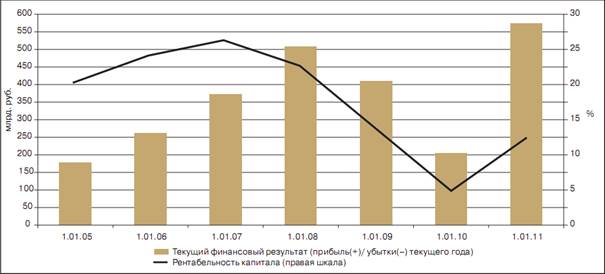 В 2010 году возобновился рост прибыли действующих кредитных организаций. На 1.01.2011 она достигла 573,4 млрд. рублей (рисунок 2.3.1). По объему полученной прибыли в 2010 году банковский сектор превысил не только уровень 2009 года, но и показатели докризисного периода. Повысился удельный вес прибыльных кредитных организаций, соответственно доля убыточных кредитных организаций сократилась. Распределение отдельных групп банков по вкладу в совокупный финансовый результат в целом соответствует их месту в активах банковского сектора. Наибольшее влияние на формирование финансового результата оказали банки, контролируемые государством, – 57,2%; банки, контролируемые иностранным капиталом, – 20,6% и крупные частные банки – 17,7%. Позитивно отразились на финансовом результате банковского сектора показатели банков, по которым осуществляются меры по предупреждению банкротства, – их убытки сократились за 2010 год с 29,7 до 0,1 млрд. рублей. Рентабельность активов кредитных организаций в 2010 году составила 1,9%, а рентабельность капитала – 12,5%, что существенно выше показателей 2009 года (0,7 и 4,9% соответственно).