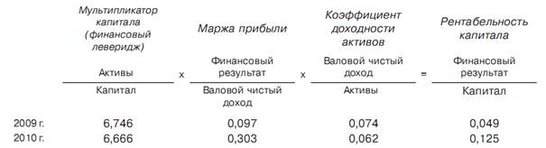 Рентабельность активов рассчитывается как отношение чистой прибыли к средней за период величине активов. Из-за неоднородной политики банков в поселекризисный период, прирост прибыли полученной банками отстает по уровню прироста активов, что повысило показатель рентабельности на не значительный уровень по сравнению с сопоставимым периодом до кризиса, превышающих 20% капитала и 3% активов показатели рентабельности не достигли. За год рентабельность активов снизилась у 53,3% от общего числа действующих кредитных организаций, а рентабельность капитала – у 50% соответственно. Анализ факторов, обусловивших повышение рентабельности капитала, показывает, что в 2010 году оно произошло под влиянием существенного роста маржи прибыли. При этом по сравнению с 2009 годом несколько снизились финансовый леверидж и доходность активов банков.