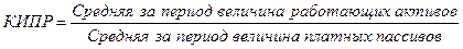 В структуре факторов формирования финансового рост прибыли в 2010 году был обеспечен в первую очередь за счет частичного восстановления сумм резервов на возможные потери. В условиях смягчения политики банков в отношении оценки кредитных рисков объем чистого доформирования резервов на возможные потери (за минусом восстановленных) за 2010 год сократился почти в 4,5 раза. В 2010 году наиболее значимой статьей увеличения прибыли оставался чистый процентный доход, его доля в факторах увеличения прибыли заметно выросла и составила 68,2% (в 2009 году – 59,5%). Из-за остаточных тенденций кризисных лет направленных на получение комиссионного дохода доля процентных доходов в общем объеме операционных доходов могла быть немного выше. Рост чистого процентного дохода в 2010 году сдерживался сокращением объема чистого процентного дохода по кредитам вследствие снижения процентной маржи по кредитно-депозитным операциям банков. Процентная маржа сокращалась под влиянием понижающихся ставок по предоставленным кредитам, в том числе по причине переоценки банками уровня рисков в экономике, и опережающих темпов прироста депозитов по отношению к кредитному портфелю банков. Оценить эффективность использования платных пассивов можно используя КИПР, он рассчитывается так (1):