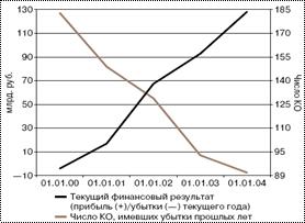Сохранилась прослеживающаяся в последние 3 года тенденция к росту количества банков, получивших прибыль (в том числе в 2003 году — с 1279 до 1284), и сокращения числа банков, допустивших убытки (в 2003 году — с 46 до 41) (см. рисунок 1.13). В итоге кредитными организациями в 2003 году получено прибыли на сумму 133 млрд. рублей, а допущенные ими убытки составили 5 млрд. рублей.