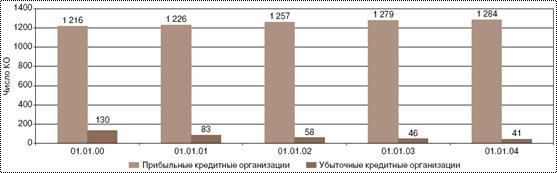 На начало 2004 года количество финансово стабильных кредитных организаций (к ним относятся банки без недостатков в деятельности — 1-я группа — и банки, имеющие отдельные недостатки, — 2-я группа), составляло 1279 (на 01.01.03 — 1269). Их доля в общем количестве действующих кредитных организаций составляла почти 95%, а в банковских активах — 96%. Средства предприятий и организаций, вклады физических лиц, бюджетные средства и меж банковские кредиты практически в полном объеме размещены в финансово стабильных банках. На банки 3-й и 4-й групп приходилось менее 1% объема указанных средств.
