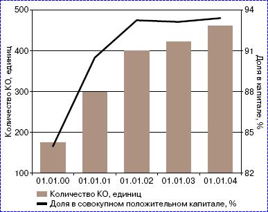 В 2003 году число региональных кредитных организаций несколько снизилось: с 666 на 01.01.03 до 650 на 01.01.04. Темпы роста активов региональных банков (33,7%) в 2003 году незначительно отличались от темпов роста совокупных активов банковского сектора в целом (35,1%). В результате доля региональных кредитных организаций в совокупных активах банковского сектора в течение года практически не изменилась (35,5% по состоянию на 01.01.04 против 35,7% на 01.01.03). Совокупный капитал региональных кредитных организаций увеличился за 2003 год на 27,6 млрд. рублей, или на 26,7%, однако их удельный вес в совокупном капитале банковского сектора снизился и по состоянию на 01.01.04 составил 16,1% (на 01.01.03 — 17,8%).