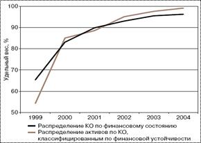 На начало 2004 года количество финансово стабильных кредитных организаций (к ним относятся банки без недостатков в деятельности — 1-я группа — и банки, имеющие отдельные недостатки, — 2-я группа), составляло 1279 (на 01.01.03 — 1269). Их доля в общем количестве действующих кредитных организаций составляла почти 95%, а в банковских активах — 96%. Средства предприятий и организаций, вклады физических лиц, бюджетные средства и меж банковские кредиты практически в полном объеме размещены в финансово стабильных банках. На банки 3-й и 4-й групп приходилось менее 1% объема указанных средств.