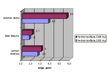 Как показывают данные в 2006 году чистая прибыль банка Lehman Brothers выросла на 23% и достигла рекордной суммы в 4 млрд. долларов. У банка Bear Stearns прибыль увеличилась на 40% до 2,1 млрд. долларов. Goldman Sachs зарегистрировал и вовсе фантастический годовой прирост чистой прибыли в 70% - 9,4 млрд. долларов.