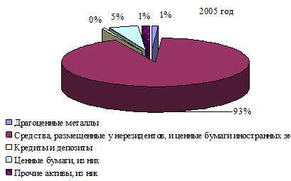 В 2005 году доля средств, размещенных у нерезидентов, и ценные бумаги иностранных эмитентов повысилась по сравнению с 2004 годом и составила 92%. Значительно снизился удельный вес по статьям "Кредиты и депозиты" и "Ценные бумаги Правительства Российской Федерации" на 4% и 3% соответственно.