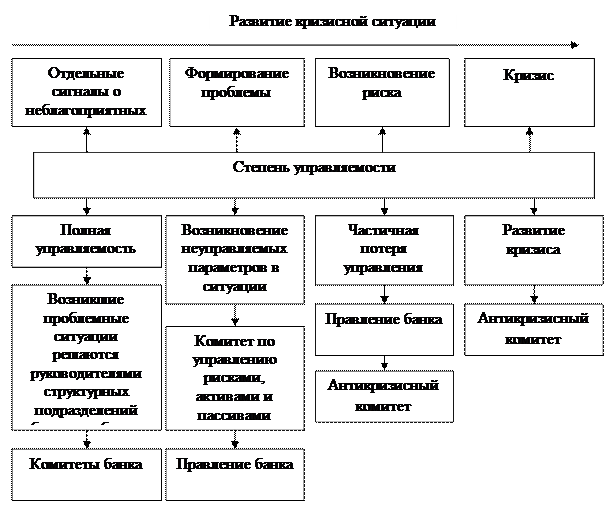 Рассмотрим регламент работы банка в условиях кризисного управления. На период кризиса в банке создается чрезвычайный антикризисный комитет в составе всех членов Правления и руководителей подразделений риск-менеджмента и финансово-экономического департамента. Антикризисный комитет наделяется следующими полномочиями на период кризиса: