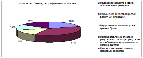В начале и середине 1990 гг. можно было наблюдать и слабую исполнительную дисциплину. Банки закрывались не только по причине отзыва лицензий, они наказывались за целый ряд нарушений. Так, только за пять месяцев в 1994 г. по Москве было оштрафовано 154 коммерческих банка. (см. Рис.1.5 2)