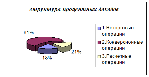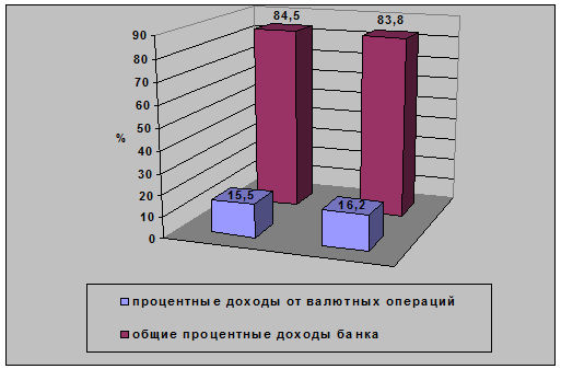 Процентные доходы занимают наибольший удельный вес в структуре доходов. В 2004 году процентные доходы от валютных операций составили 15,5% в общем объеме доходов банка, в 2005 году – 16,2%,что составляет 0,7 пункта прироста по сравнению с 2004 г. Это видно на рисунке 5.