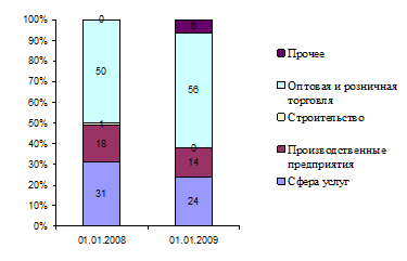 В рамках кредитования СМБ Русь-Банк осуществляет финансирование всех сфер экономики: оптовая и розничная торговля получили 56% всего объема кредитования, сфера услуг — 24%, производственные предприятия — 14% (рисунок 11).