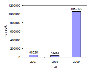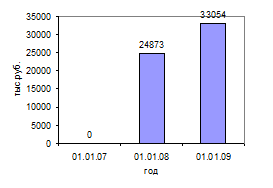 Здесь наблюдается начало деятельности в 2007г., к 2009 году данный показатель возрос на 33% по сравнению с 2007г. и составил 33054 тыс.руб.