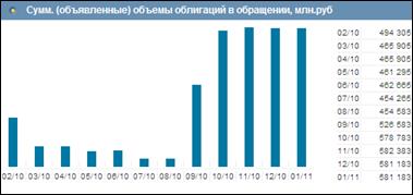На начало 2010 г. суммарный (объявленный) объем муниципальных облигаций, в обращении, оценивался в 494 305 млн. руб., а к началу 2011 г. его объем достиг 581 183 млн. руб. (рис. 1).