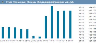 На начало 2011 г. на рынке обращалось 95 выпусков на сумму 424 881 млн. руб., что указывает на уменьшение выпусков на 9% в сравнении с началом 2010 г. (рис. 2).