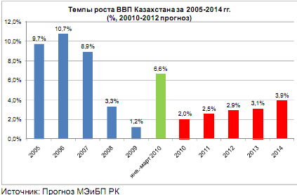 Правительство Казахстана планирует рост ВВП в 2010 году до 1,5 – 2,0%. МВФ прогнозирует рост ВВП Казахстана в 2010 году на 2%, ЕБРР – на 3,5%