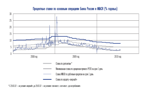 Процентные ставки по основным операциям на российском финансовом рынке во II квартале 2010 г. продолжали снижаться вследствие понижения Банком России процентных ставок по своим операциям и увеличения совокупных безналичных банковских резервов.
