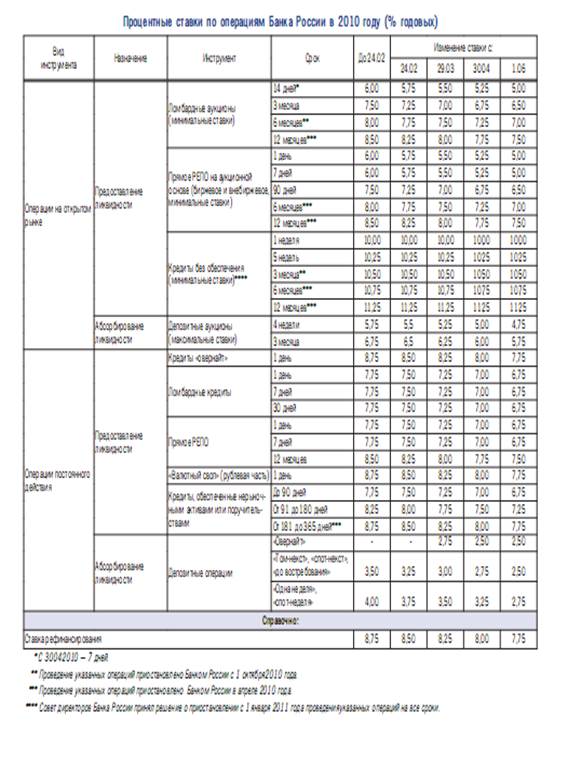 Таблица 1. Процентные ставки по операциям Банка России в 2010 году
