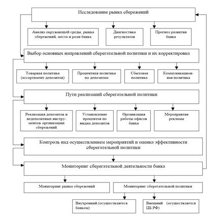 Взаимосвязь сберегательной и депозитной политики коммерческого банка следующая: с одной стороны, основные направления депозитной политики являются элементами формирования сберегательной деятельности банка (например, ассортимент депозитов, процентная политика, продвижение продукта на рынке, организация работы соответствующих подразделении коммерческого банка). С другой стороны, назвать депозитную политику составным элементом сберегательной политики банка нельзя. Депозитная политика банка – это более широкое понятие, включающее кроме стратегии и тактики привлечения ресурсов на возвратной основе, также организацию и управление депозитным процессом.