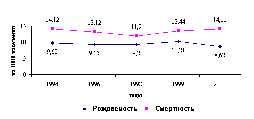 Как мы видим, динамика рождаемости остаётся практически неизменной до 1999г., в дальнейшем же она начинает снижаться незначительными темпами с 10,21 до 8,62. Что касается смертности, то она также незначительно колеблится, но, начиная с 1999г. возрастает и доходит практически до уровня 1994г.–14,12.
