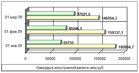 Из таблицы 2.5 видно, что удельный вес депозитов в иностранной валюте за анализируемый период увеличился и составил на 01.03.2009г. 97021,6 млн. рублей. Удельный вес депозитов в белорусских рублях на оборот снизился с 72,2 % до 60,2%. Более наглядно это можно увидеть на рисунке 2.3.