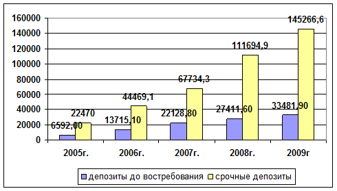 Из таблицы 2.6 видно, что удельный вес срочных вкладов увеличился за анализируемый период на 1,1%, и на 01.01.2009 года сумма составила 145266,6 млн. рублей, что на 122796,6 млн. рублей больше, чем на начало 2005 года. Более наглядно это показано на рисунке 2.4.