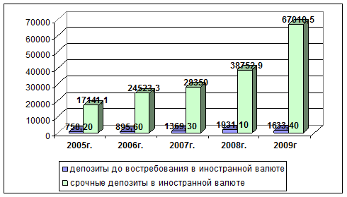 Данные таблиц (см. таблицу 2.6 и таблицу 2.7) указывают на стабильный рост остатков вкладов, как в белорусских рублях, так и в иностранной валюте. По состоянию на 01.01.2005г. сумма вкладов в национальной валюте составляла 29062,6 млн. рублей, а к 2009 году выросла в 6,2 раза и составила 180884,7 млн. рублей. В иностранной валюте сумма увеличилась с 17899,3 млн. рублей по состоянию на 01.01.2005г. до 69755,0 млн. рублей по состоянию на 01.01.2009г., или в 3,9 раза.