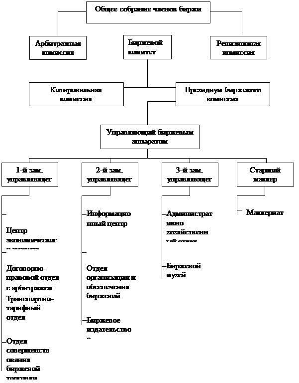 · Ревизионная комиссия - осуществляет ревизию финансовой деятельности биржи; подготовку отчета для заслушивания на общем собрании учредителей и членов биржи; оказание консультаций организациям и лицам.