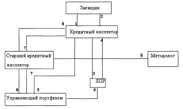 Непосредственное взаимодействие банка с заемщиком обеспечивается в процессе выполнения служебных обязанностей группой сотрудников кредитного подразделения, представителя которой мы условно обозначаем кредитный инспектор. Взаимодействие заемщика и кредитного инспектора носит характер двустороннего информационного обмена, обозначенного на схеме стрелками 1 и 2. Кредитный инспектор получает от заемщика информацию о параметрах предполагаемой кредитной сделки, данные необходимые для оценки кредитного риска данного заемщика, данные мониторинга финансового состояния и показателей деловой активности, необходимые для оценки изменения кредитного риска заемщика в период до истечения срока сделки. Также кредитный инспектор получает информацию о выполнении либо не выполнении заемщиком условий кредитной сделки, перспектив возврата предоставленных кредитных ресурсов и уплаты процентов. С другой стороны, заемщик информируется кредитным инспектором об условиях кредитования, принятом банком решении о предоставлении/отказе в предоставлении кредита. Взаимодействие кредитного инспектора с лицом, принимающим решение (ЛПР - должностное лицо, кредитный совет, или какой-либо орган в системе управления банком, в компетенцию которого входит принятие решения о выдаче/отказе в выдаче кредита, изменении условий кредитного соглашения, санкционирование применения мер воздействия на заемщика, нарушившего условия кредитного соглашения и т.п.) основано на предоставлении кредитным инспектором информации, необходимой для принятия того или иного решения в рамках кредитных операций, и доведении до сведения кредитного инспектора принятого решения. Принятие ЛПР решения означает для кредитного инспектора руководство к действию. Кредитный инспектор информирует ЛПР об условиях кредитной сделки, доводит до его сведения результат проведенной оценки кредитного риска данного потенциального заемщика, а также предоставляет сведения об изменении оценки кредитного риска заемщика в период между выдачей кредита и сроком завершения кредитной операции (стрелка 3 на схеме). Кредитный инспектор предоставляет ЛПР сведения о выполнении заемщиком условий кредитного соглашения, либо невозврате кредита. ЛПР предоставляет руководство к исполнению по каждому факту его информирования со стороны кредитного инспектора (стрелка 4 на схеме).