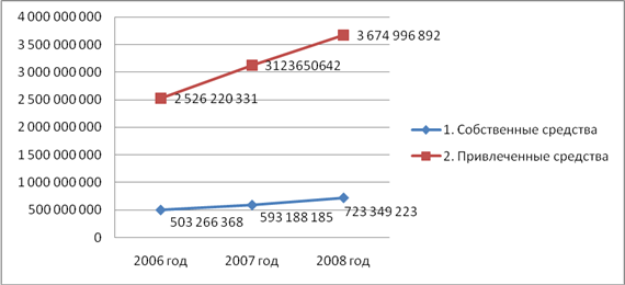 Следовательно, по таблице 4 и рисунку 4 можно сделать вывод о том, что за анализируемый период привлеченные средства в общей сумме банковских ресурсов занимают преобладающее место, нежели собственные средства. Их доля составляет более 83% в 2008 году. В целом объем банковских ресурсов за период с 2006 по 2008 года увеличился на 45% или на 1,368 млрд. рублей и составил более 4,398 млрд. рублей.