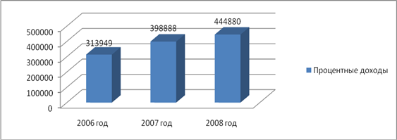 Высокими темпами растут процентные доходы. В 2007 году по сравнению с 2006 годом они выросли в 1,27 раза, что на 84 939 тыс.руб. больше. В 2008 году по сравнению с 2006 они выросли в 1,4 раза, что составляет 130 931 тыс. рублей.