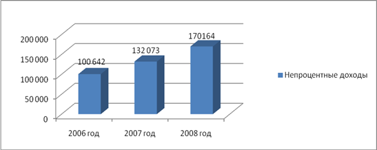 Высокими темпами растут непроцентные доходы. Так например, в 2007 году по сравнению с 2006 они выросли в 1,3 раза, что на 31 431 тыс. руб. больше. А в 2008 году по сравнению с 2006 они выросли на 69 522 тыс. руб. или в 2 раза.