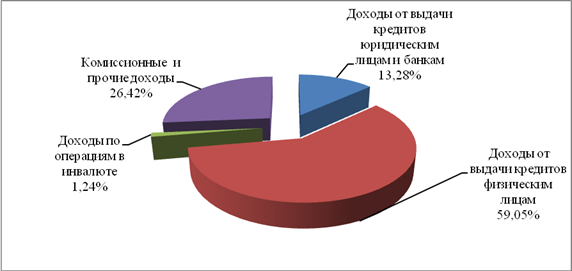 Как видно из диаграммы в 2008 году наибольшую долю занимают доходы от выдачи кредитов физическим лицам (59,05%), на втором месте – доходы от выдачи кредитов юридическим лицам и банкам (26,42%).