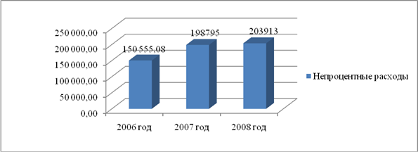 Незначительными темпами непроцентные расходы увеличиваются за 2006-2008 года. Так, в 2008 году по сравнению с 2007 они выросли в 1,02 раза или на 5 118 тыс. рублей. А в 2008 по сравнению с 2006 непроцентные расходы увеличились на 53 357,92 тыс. рублей или в 1,35 раза.