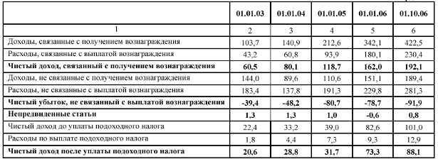 На 1 октября 2006 года банками второго уровня был получен совокупный чистый доход в размере 88,1 млрд. тенге, что по сравнению с началом 2003 года больше в 4,3 раза (по состоянию на 1 октября 2005 года – 53,1 млрд. тенге). Совокупный размер доходов на ту же дату составил 613,0 млрд. тенге, увеличившись в 2,5 раза по сравнению с суммой дохода на 1 января 2003 года (на 1 октября 2005 года – 334,6 млрд. тенге). Совокупный размер расходов за период с начала 2003 года по сентябрь 2006 года вырос в 2,3 раза до 524,9 млрд. тенге (на 1 октября 2005 года – 281,5 млрд. тенге ) (Таблица 7).