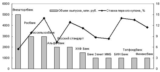 На текущий момент в обращении находятся рублевые облигации российских банков на сумму более 70 млрд. руб., векселя – более, чем на 560 млрд. руб. Количество кредитных организаций-эмитентов облигаций составляет 33, векселей — более 900. В общем списке наравне с крупными известными эмитентами присутствуют также банки «второго круга», в том числе и региональные. На первую десятку крупнейших эмитентов приходится около 80% всего объема находящихся в обращении облигаций банков РФ в национальной валюте. У остальных банков средний размер выпуска незначительно превышает 470 млн. рублей (рис.9).