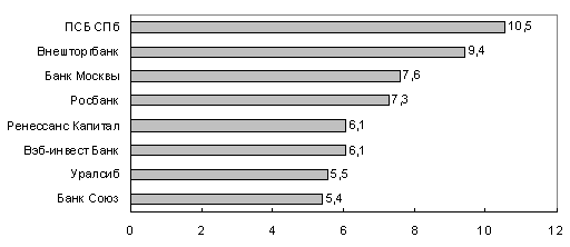 Осуществляя операции на рынке ценных бумаг, банки размещают собственные ценные бумаги, а также оказывают услуги андеррайтинга другим компаниям – эмитентам. Объемы операций ведущих банков – андеррайтеров представлены на рис.10.