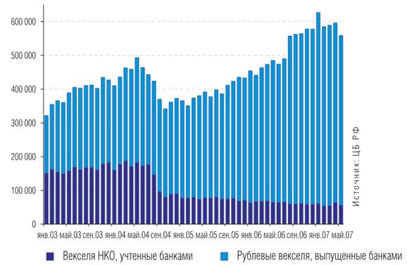 Из них на долю «рыночных» выпусков векселей (со сроком погашения от 1 месяца до 3 лет) пришлось около 502,3 млрд руб, что на 11,3% меньше, чем в начале 2007 года. Доля рыночных выпусков в общем объеме выпущенных банками векселей сохраняется на уровне 82% против 32% в 2001году. Наибольшую долю (36%) в портфеле векселей стали занимать векселя сроком погашения от 6 до 12 месяцев, и 34% приходится на векселя со сроком погашения от 1 года до 3 лет.