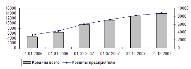 Анализ данных таблицы позволяет сделать вывод о том, что к началу 2008г. по сравнению с 2005г. кредитов было выдано больше на 210,4 %, что составило в абсолютном выражении 13 856,4 млрд. руб. Данное увеличение произошло в результате увеличения кредитов юридическим и физическим лицам.