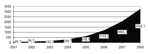Как показал анализ, темпы прироста объемов кредитов, выданных физическим лицам, имеют высокие значения. Однако, если в период 2001-2005гг они составили 1284%, то в период 2005-2008гг. – 423%, что свидетельствует о насыщении рынка потребительских кредитов и некоторое замедление его развития. Данная ситуация является нормальным явлением для развивающегося сектора рынка, т.к. после периода роста всегда начинается период стабилизации, что и наблюдается на графике.