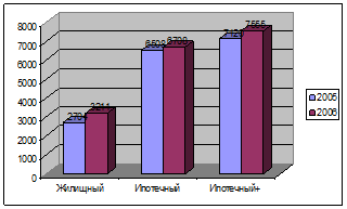 На основании анализа данных рис. 2.1 видно, что ипотечные кредиты, выдаваемые Юго-Западным Банком Сбербанка РФ, в 2006 году выросли по сравнению с 2005 годом; причем наибольший рост отмечен по кредиту «Жилищный». Это связано как с улучшением экономической ситуации в стране, так и с оптимизацией кредитной политики Юго-Западного Банка. При этом сумма предоставляемых ипотечных кредитов выросла в 2006 году на 7%,; в то время как общая сумма предоставляемых кредитов – всего лишь на 3,46%.