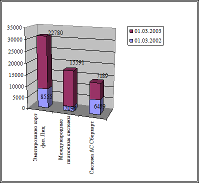 В 2003 г. Тверской Сбербанк продолжил эмитировать банковские карты. По сравнению с соответствующим периодом 2002 г. в основном развивались карточные продукты международных платежных систем(рис 3.7, 3.8).